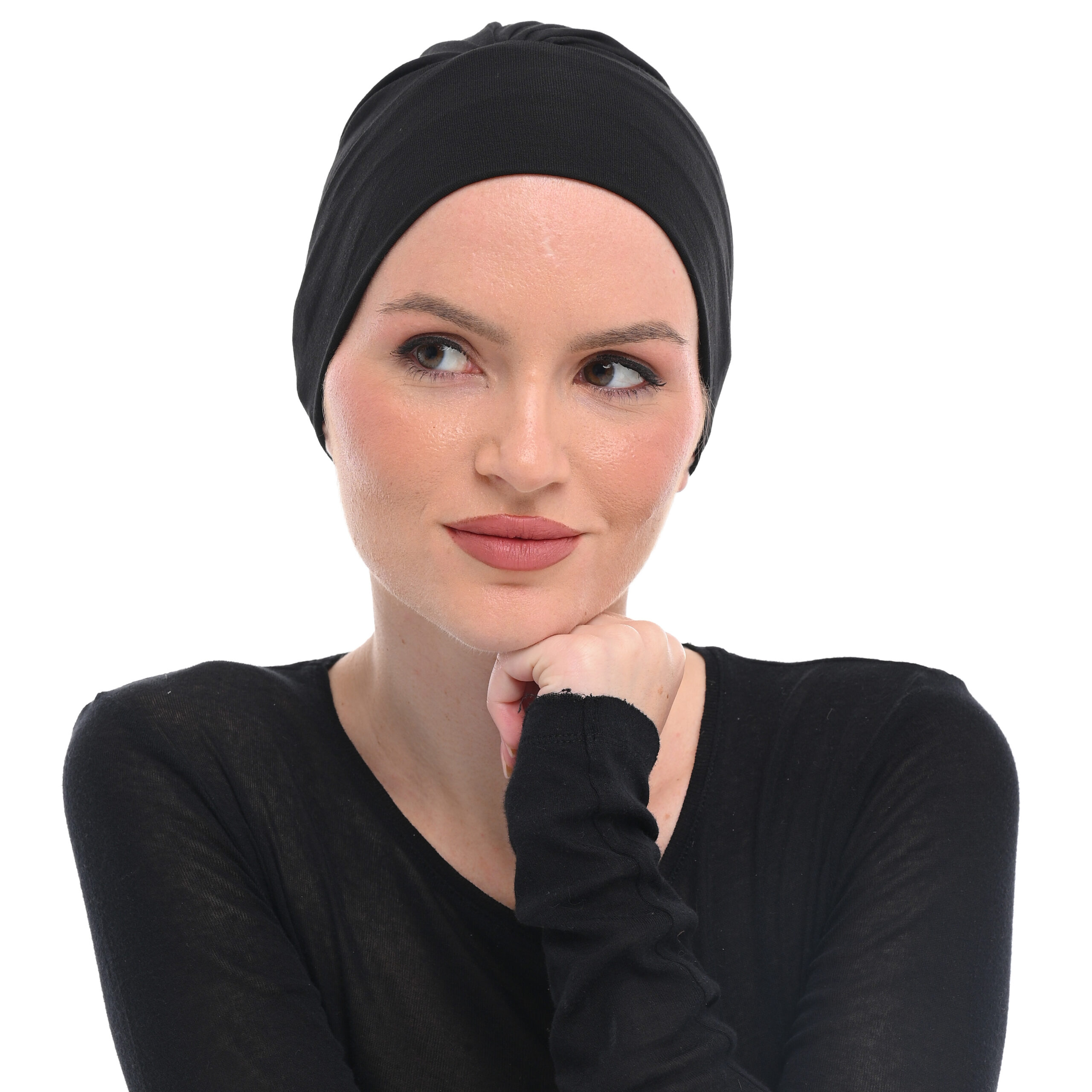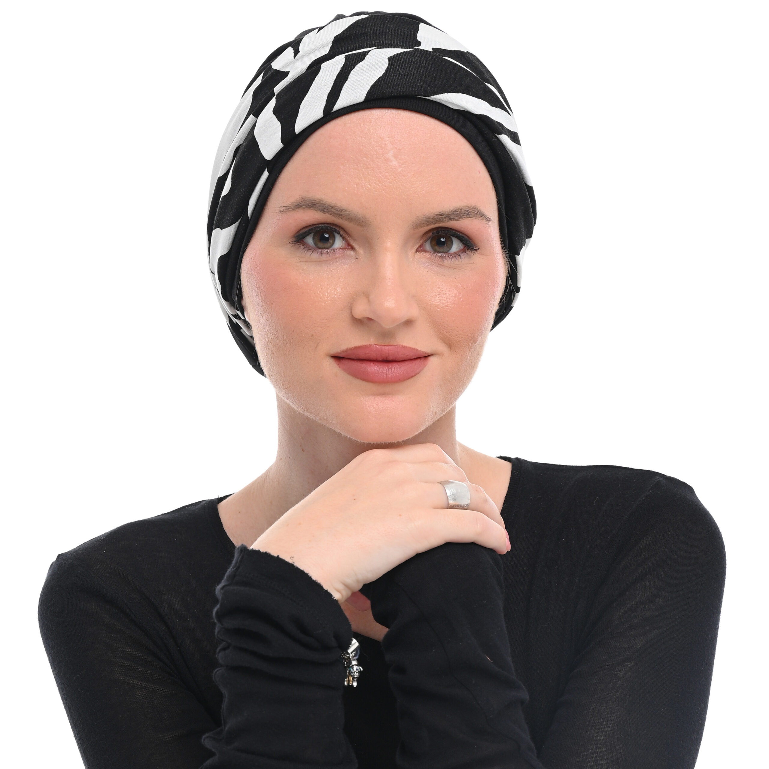 Πρακτικό και μοδάτο σκουφάκι με έξρα κορδέλα προσφέροντας απαλή αίσθηση και εκλεπτυσμένη εμφάνιση, με σχεδιασμό που αναδεικνύει τη φυσική γραμμή του κεφαλιού. 95% βισκόζη , 5% μπαμπού. ONE SIZE